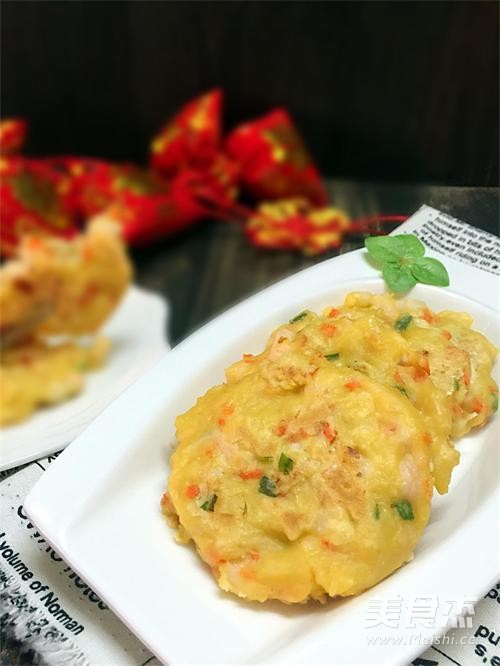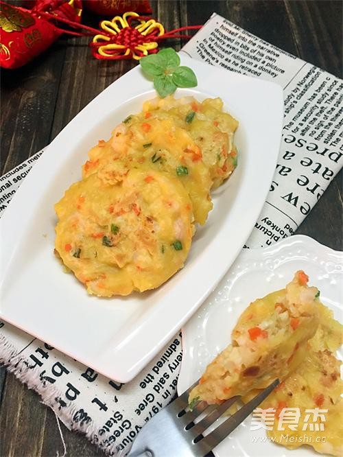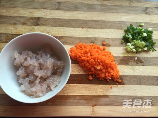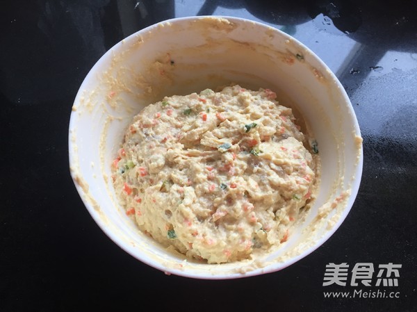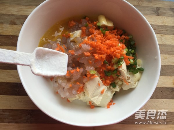 把豆腐、胡蘿卜、蝦仁、蔥放入大碗內,再倒入蛋液