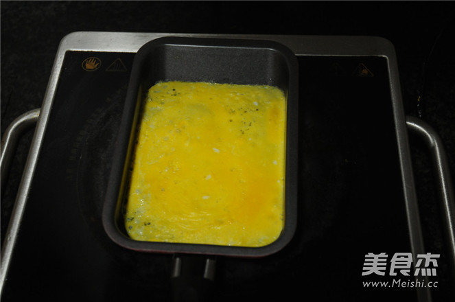 油鍋燒熱後轉400度的小火,舀兩勺蛋液進去,慢慢晃動煎鍋將蛋液煎至凝固