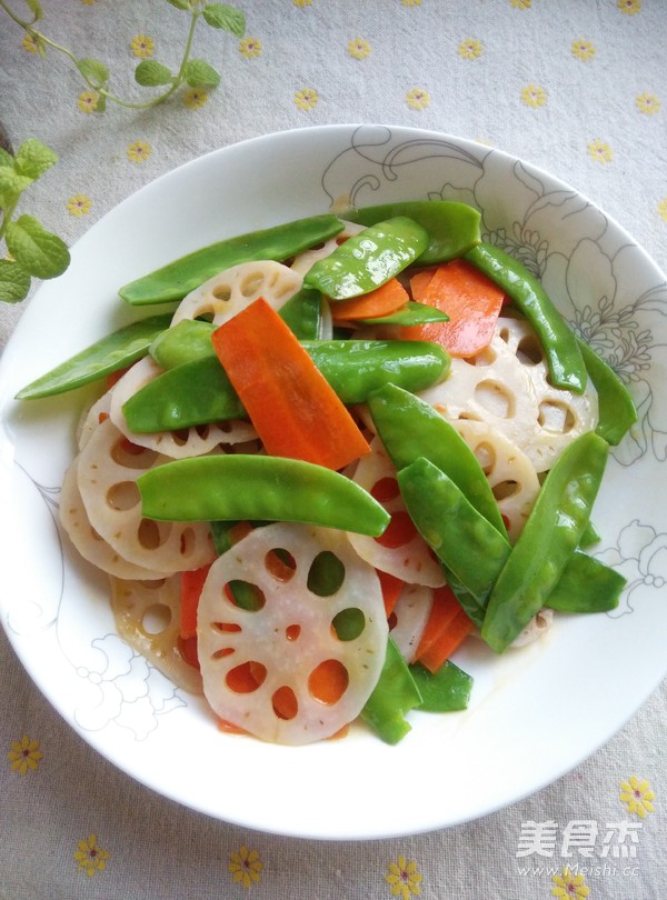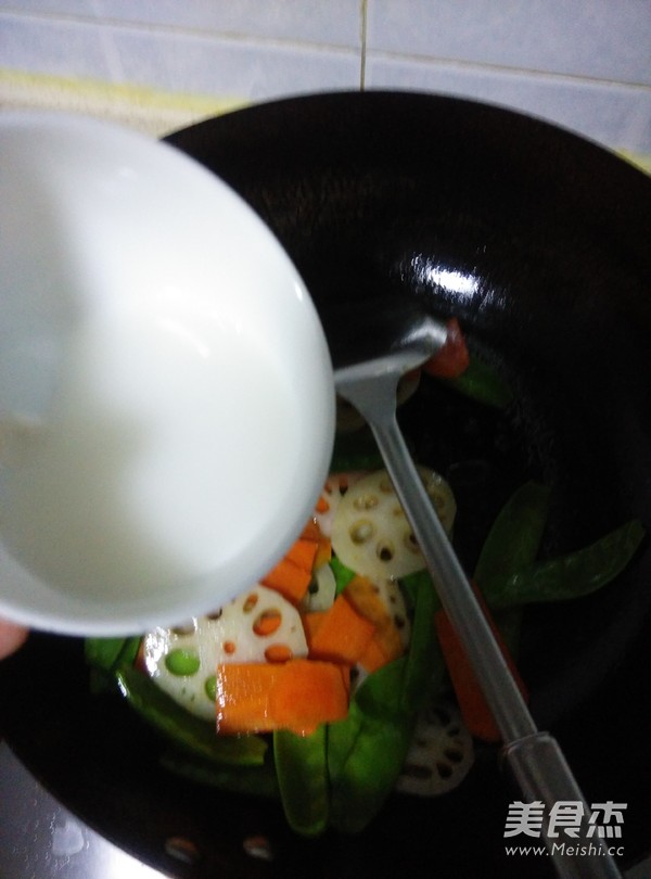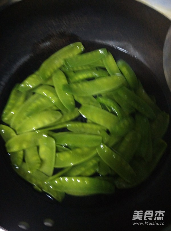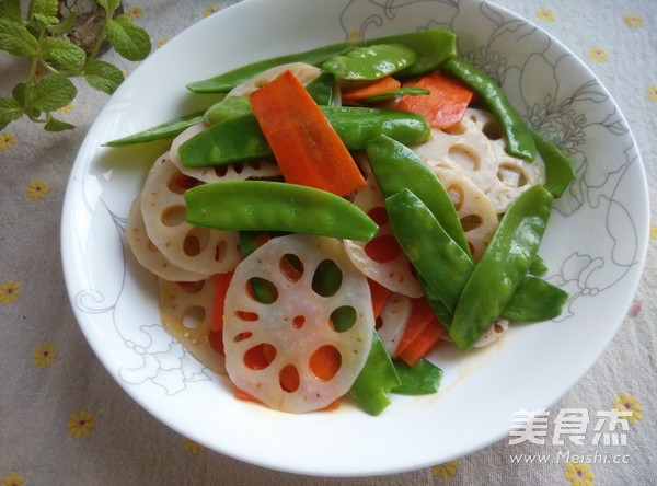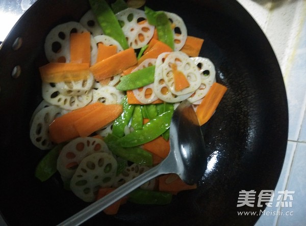 放入藕片和荷蘭豆炒勻
