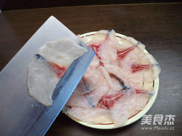 魚肉切雙飛,即第一刀片下去後,到魚皮的位置即收刀,注意不要切斷,第二刀的時候再切斷,打開魚片即成雙飛,切好的魚片用少許鹽,胡椒粉抓勻腌制一下