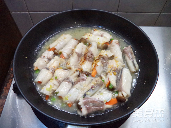 加入開水燒滾,同時調入適量生抽,蚝油等調味料,接著把魚卷放入鍋中,轉中小火煨熟後,取出裝盤