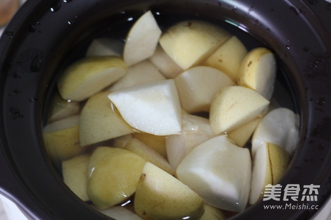 把南北杏、蓮子、川貝、百合洗淨, 雪梨取芯切塊