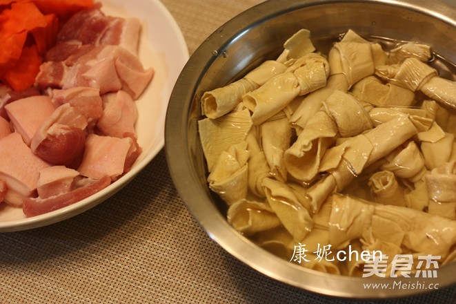 准備食材:豆腐結提前浸泡,要把豆腐結泡軟,五花肉切小方塊,胡蘿卜削皮滾刀切塊