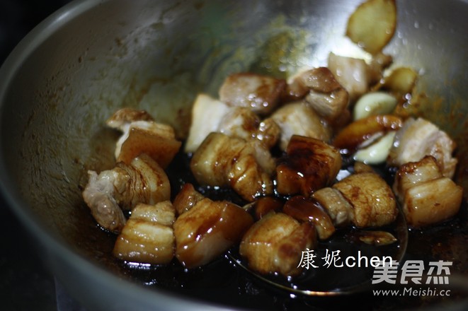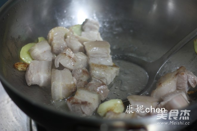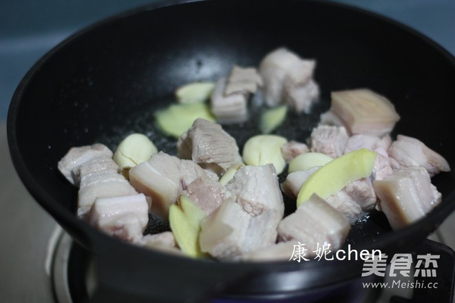 炒鍋放一勺油和砂糖,用小火將砂糖融化,放入五花肉塊和姜片蒜肉一起翻炒