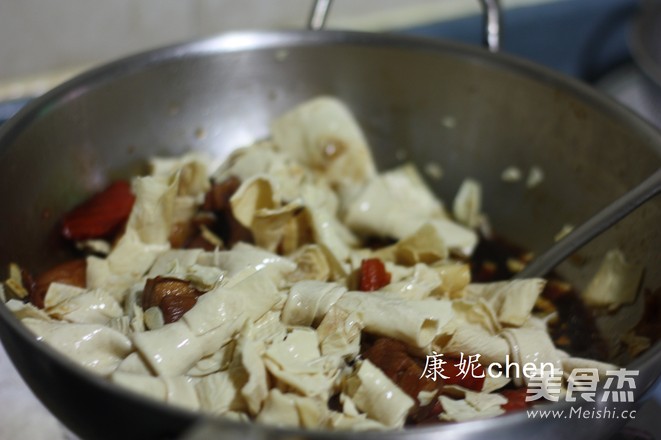 湯汁即將收干時,放入豆腐結,翻炒均勻