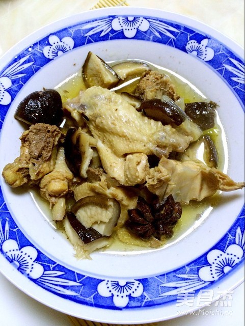 把雞、香菇、放入壓力鍋中,加入姜片,蔥段,大料,少許花椒