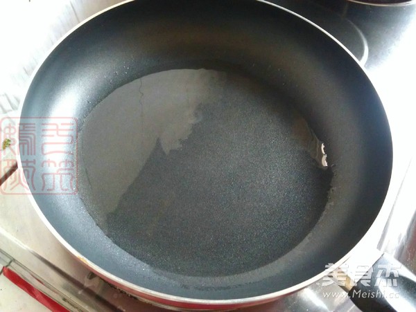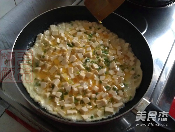 將豆腐蛋液倒入鍋中,用竹鏟攤平,