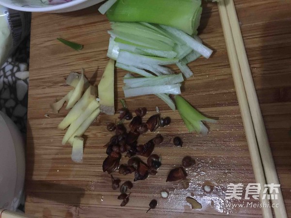 將配料准備好,蔥姜切絲,辣椒切段(此處辣椒沒拍著,深色的那個是八角),蒜切片