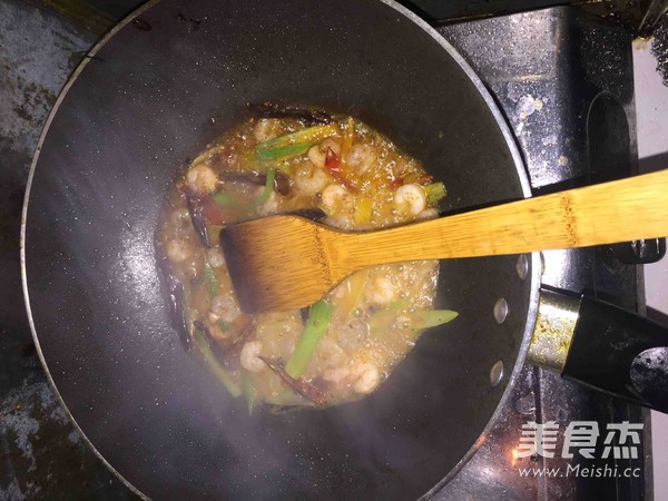 將辣椒放入鍋中翻炒後,將蝦仁放入。