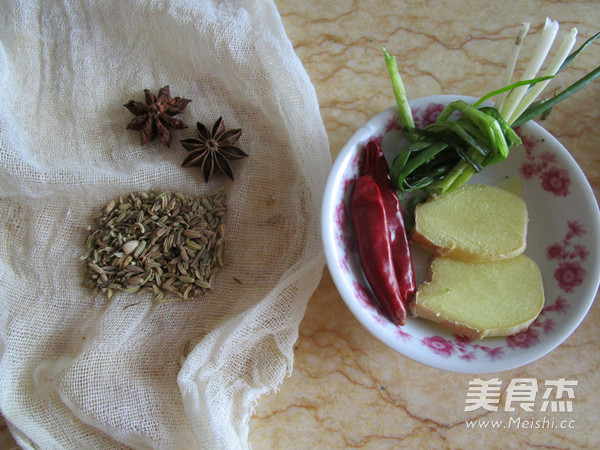 把小茴香和八角用紗布包好,生姜切片,小蔥打結,干辣椒准備