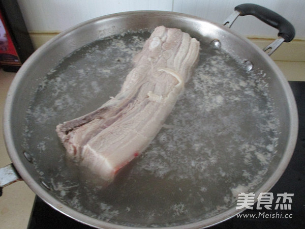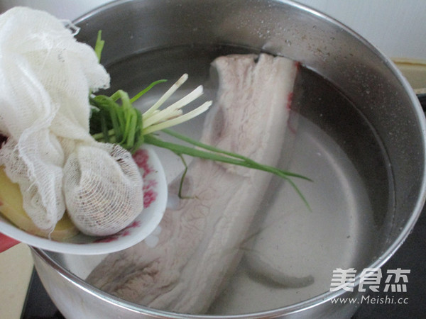 另起鍋加入豬肉注入清水,水量能浸沒豬肉為佳,把調料加入