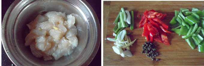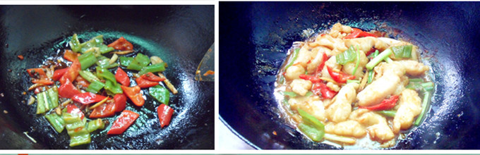 放入青、紅椒塊、蔥煸炒,最後放入魚塊炒至熟即可。