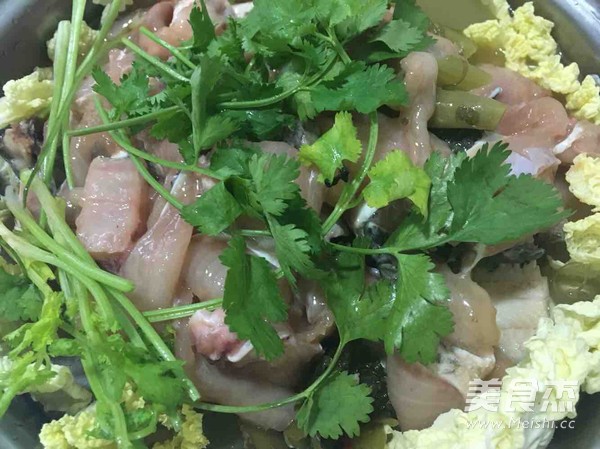 魚片分開平鋪在最上層,放點香菜