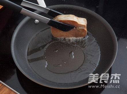 平底鍋加熱後,放入油,先煎魚皮。