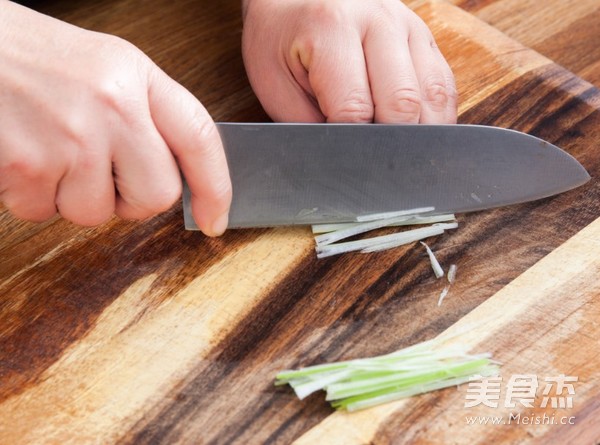 魚蒸好後,將多余的湯汁倒掉,大蔥切絲,放在魚身。