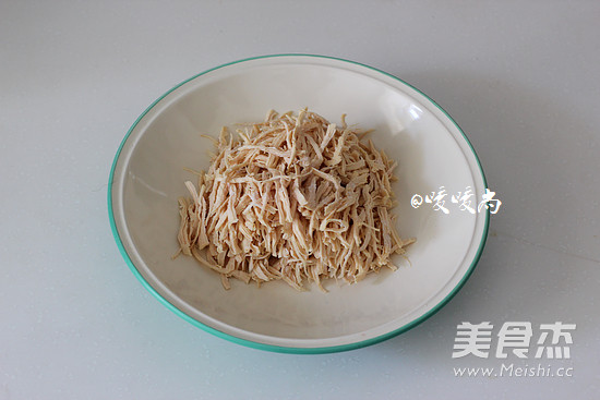 將焖煮好的雞胸肉取出晾涼,用擀面杖敲打一下後撕成絲。