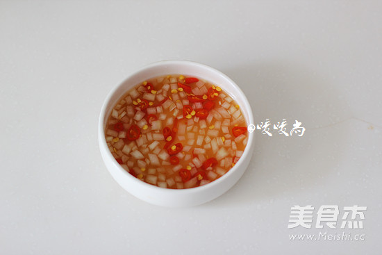 魚露、涼白開和白糖調勻,擠入1個青檸汁,加入切好的小米椒碎調勻作為料汁(1個小米椒就足夠辣了)。
