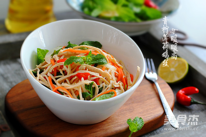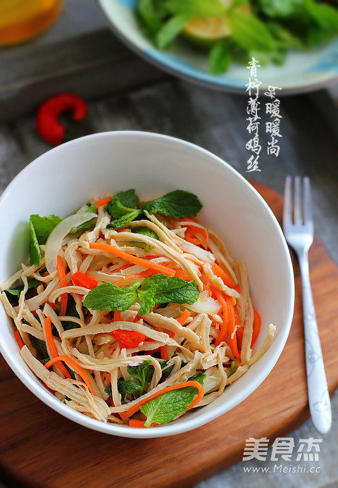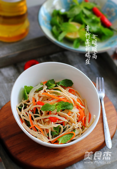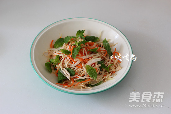 薄荷葉、雞絲、胡蘿卜絲和洋蔥絲混合,調入步驟4調好的料汁拌勻即可食用。