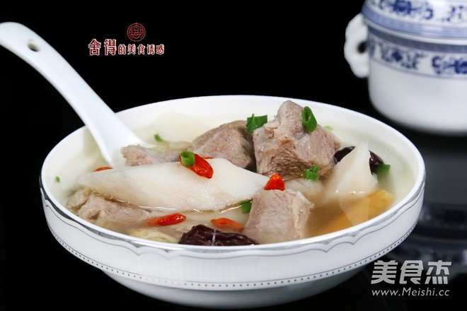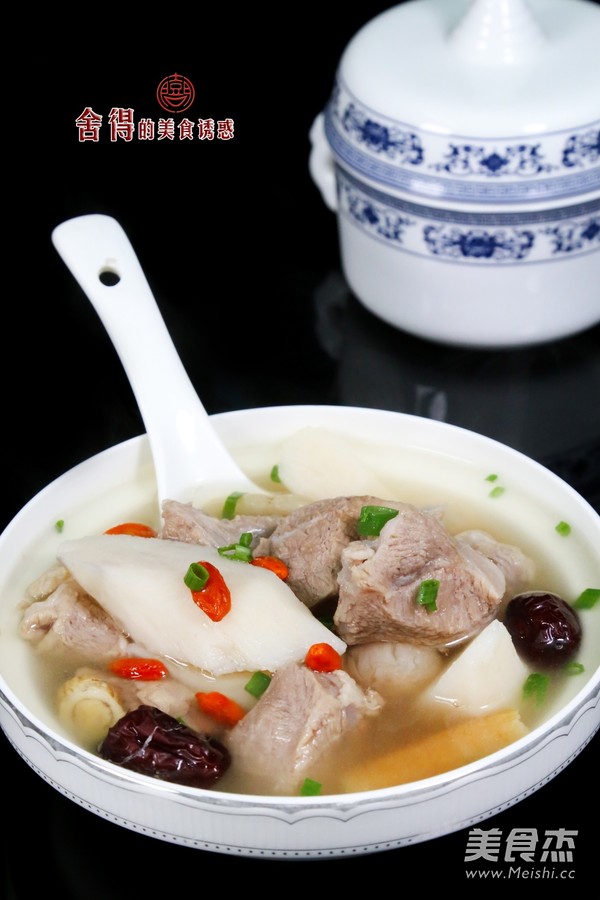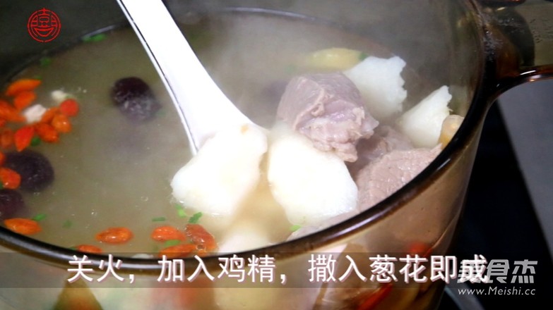 煲中一次注入足夠的水後倒入羊肉塊,倒入鐵棍山藥、生姜、紅棗、黨參、黃芪、麥冬、桂圓干,開大火,加入適量的鹽,蓋上鍋蓋大火燒開,轉微火煲3.5小時。