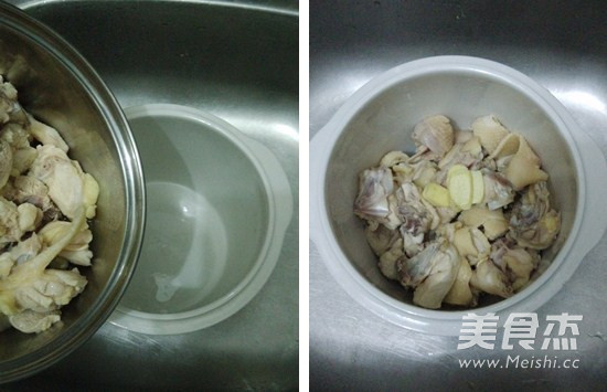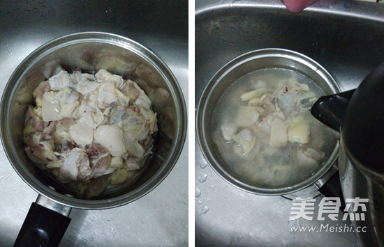 雞斬塊洗干淨,我是叫外面買雞幫忙斬好的,倒入剛開的開水焯一下,除去血水,然後倒掉