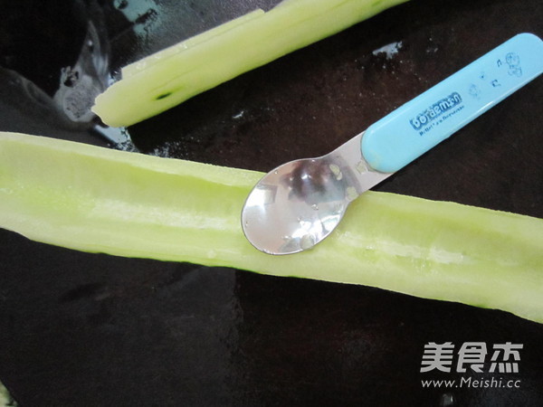 黃瓜去掉頭尾,去皮,用勺子刮掉瓜瓤