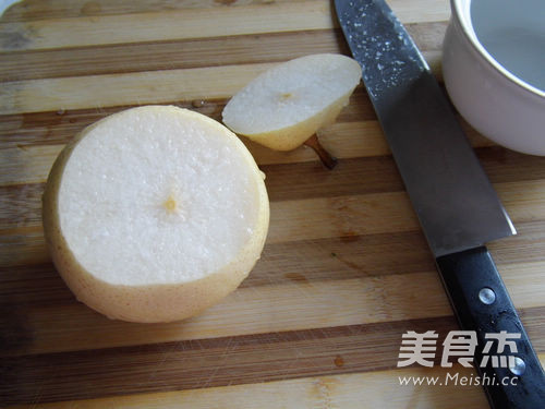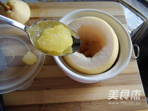 用小勺挖去梨核,把雪梨清理干淨後放入冰糖