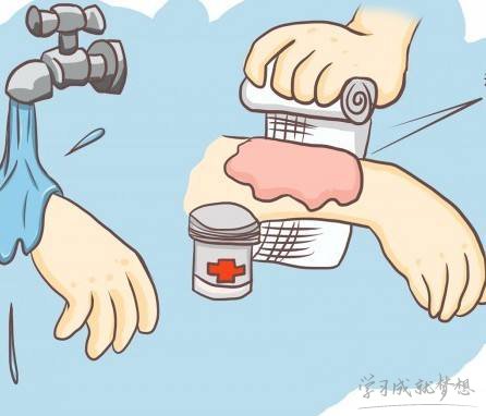 第三步,將燙傷處的皮膚拭干,並在創面塗些藍油烴、綠藥膏等油膏類藥物,再適當包扎1―2天。要注意的是,面部不要包扎,燙傷處皮膚應保持清潔和干燥。如有小水疱形成,注意不要弄破,應讓其自行吸收;如果水疱較大,須到醫院讓醫生處理。