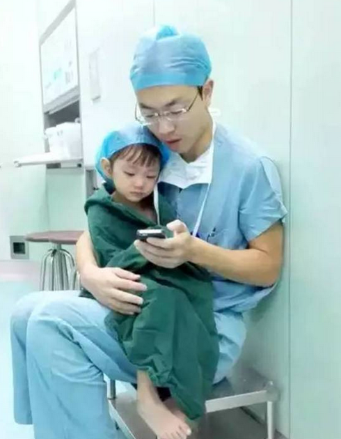 小女孩要接受心髒手術,因為害怕大哭,男醫生便抱著她一起看卡通、安撫她,直到女孩情緒穩定下來。
